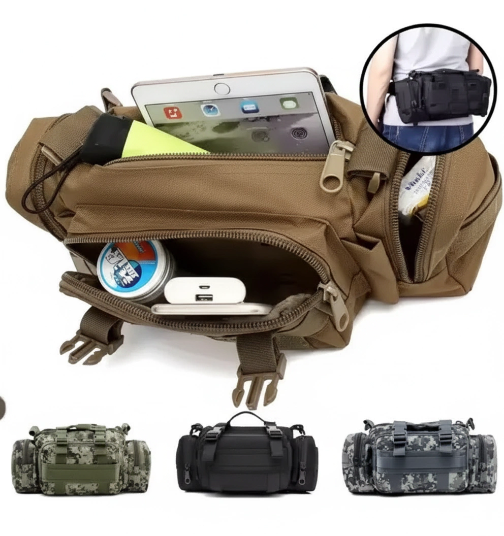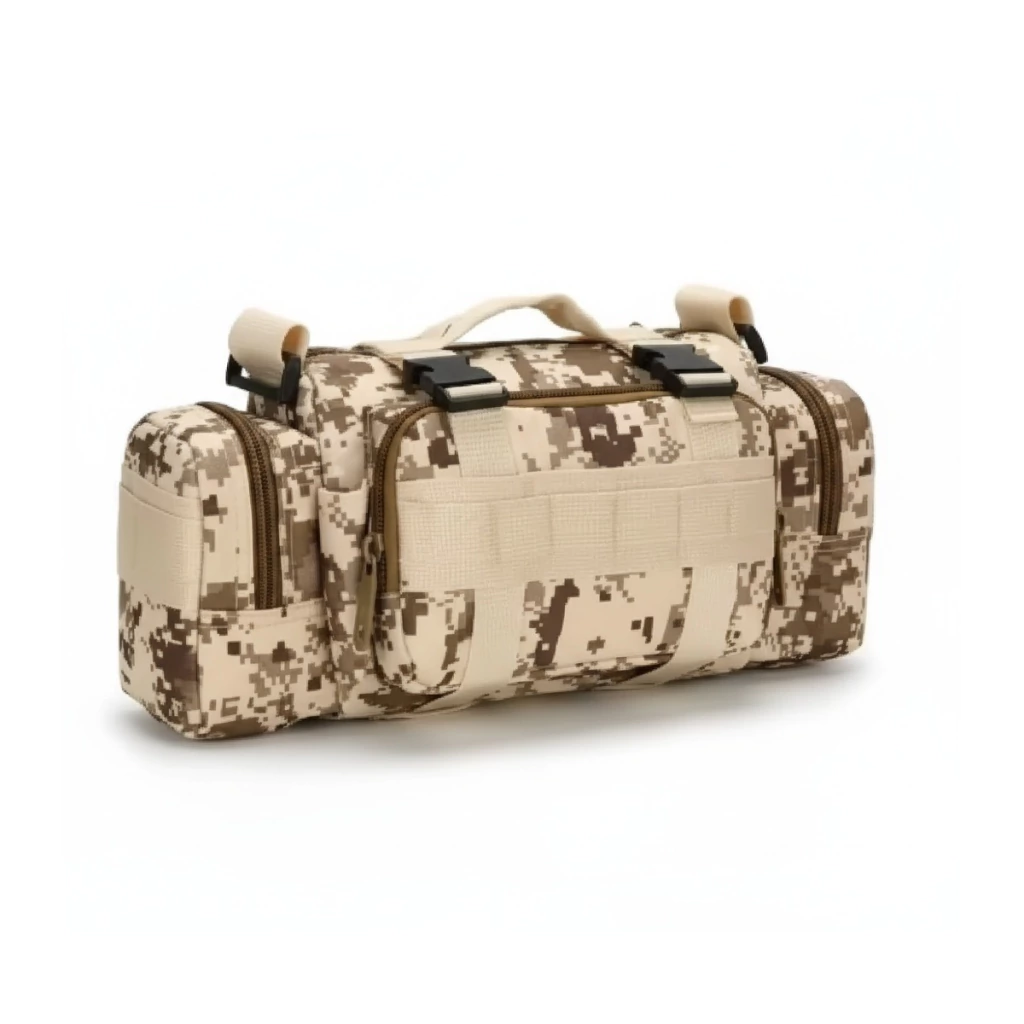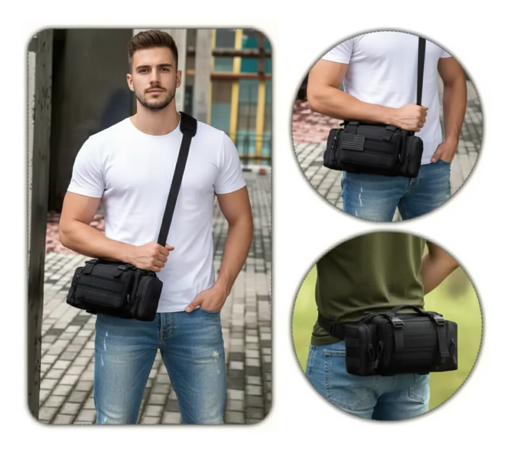 - Al ser sistema Molle se puede usar como bolso de lado, cruzado o riñonera o enganchar en el manubrio de una moto o bicicleta.